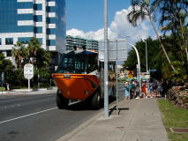 翌日5月5日自由行動。朝寝坊してゆっくりご飯を食べた。全快!! 昼前から、サーファーズパラダイスに繰り出した。町に行く途中に変わった車を発見。 車高が高い。とりあえず写真撮影した。なにかな?と思いながら。出発しようとしていた。 そこうしているうちににぎやかな町に到着。海が目の前にあるので水着姿の方があちこちに 日本人相手の店も多い。日本語の看板があちこちにあった。ぼったくられるから注意!! 現地の人が買い物する店が一番安全。両替も至るところにあるので安心。 オーダーしても20分くらい待たないと来ないときいていたので、昼はファーストフードで食事をすることにした。日本語がつうじない。かたことの英語でなんとかオーダーどおりのものが出てきてホッとした。サイズはやはり大きかった。飲み物も600mlが普通サイズみたいです。海を見ながらの食事は格別でした。味はなかなかおいしかった。 その後海岸にいった。波が高いので、サーフィンやボディーボードむき。泳いでいる人はごくわずか、あとは日光浴、読書、ビーチバレー。観光客はもっぱら写真撮影に明け暮れていた。確かにすごくきれいでした。ブルーとグリーン。遠くには、高層ビルが見える気分は最高。何時間でも海を見ていてもあきないなー。砂浜は、本当ゴミひとつ落ちていない。砂がすごくこまかく滑らかなので歩くだけでも気持いい。鮫がでるのでいつも監視するひとがいるらしい。泳げる所も決められていた。