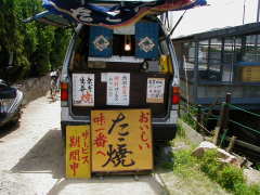 御地蔵さんの隣でおいしいにおいがしていました。前を通るとつい見てしまうバンの車をお店にしています。中央高校の隣ということで、学生のちょっとしたくつろぎの場所になっているそうです。授業を抜け出してきた学生には、自分の経験をふまえてきちんと話をされるそうです。いわばお父さん的存在です。