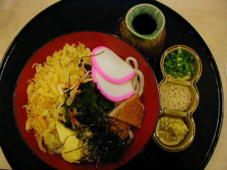 雨のチボリ公園は? ○「和食處くらしき」で昼食 唯一の和食の店 手打ちうどんが売り。「五色ぶっかけうどん(冷)」950円 冷たいお茶はお変わり自由。 かまぼこ、わかめ、きざみのり、卵焼き、てんかす、干しエビ、てんぷら
