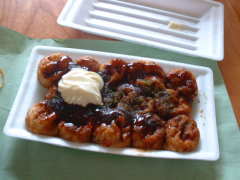ここはお好み焼きも焼きそばも焼きうどんもなにわ饅頭もあります。お姉さんがやってます。
